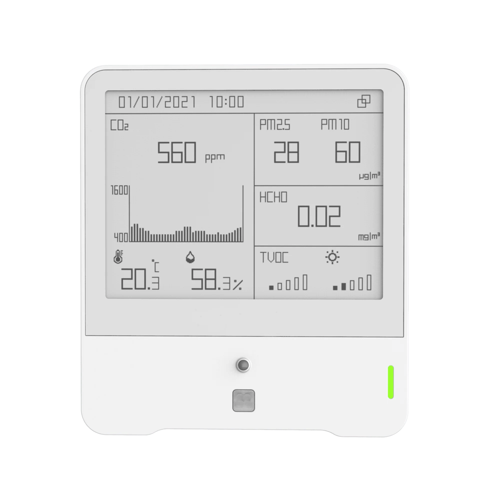 The AM308L-868M indoor air quality monitor delivers precise, real-time measurements of temperature, humidity, light, carbon dioxide (COâ‚‚), total volatile organic compounds (TVOC), barometric pressure, PM2.5, PM10, and motion. Its compact design and E-ink display facilitate straightforward monitoring of indoor environmental conditions across various settings, including offices, classrooms, and hospitals. This sensor provides essential data for evaluating and managing indoor air quality, thereby enhancing the health and comfort of occupants. R6727,50